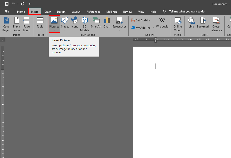 Untuk menambahkan sebuah gambar di microsoft word, kalian masuk ke menu Insert > Pictures > pilih gambar yang akan ditambahkan ke dokumen.