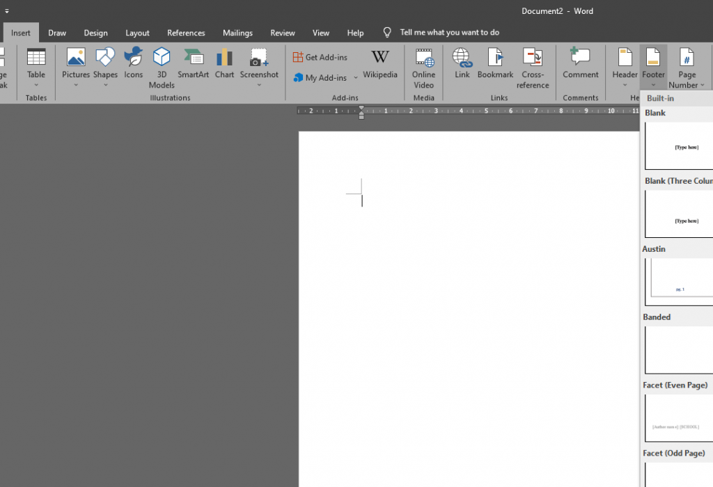 Cara untuk membuat header dan footer sangatlah mudah. Kalian hanya perlu masuk ke menu Insert > pilih Header atau Footer sesuai dengan kebutuhan > kemudian pilih jenis header atau footernya.