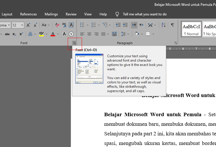 Pertama kalian masuk ke menu Home > kemudian pilih icon arah panah ke bawah pada Font atau bisa menggunakan tombol kombinasi Ctrl + D pada keyboard.