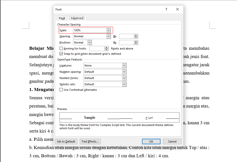 Kemudian pilih menu Advanced. Pada bagian Spacing, ubah sesuai dengan kebutuhan. Jika kalian memilih Expanded, maka akan membuat spasi luas. Sedangkan jika kalian memilih Condensed, maka akan membuat spasi rapat.
