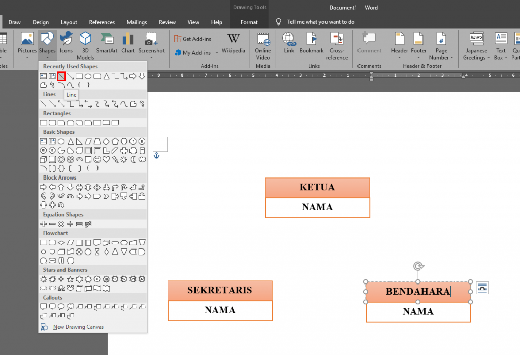 Setelah disusun tinggal diberi garis penghubung agar menjadi satu kesatuan. Cara untuk membuat garis adalah dengan masuk ke menu Insert > Shapes > Lines.